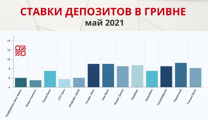 Открыть депозитный вклад в мае предлагают 25 украинских банков. Средняя ставка для годового депозита на сумму в 50 тысяч гривен в мае составляет 6,75% в сравнении с 6,80%, которые можно было наблюдать в конце апреля. Украинские банки и дальше продолжают снижать процентные ставки по гривневым депозитам, независимо от срока действия программ.