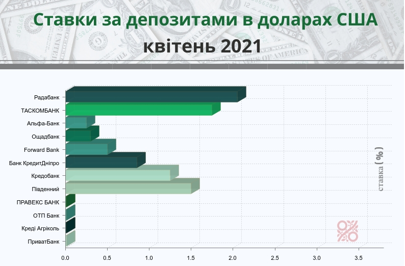 Середня сума, яку українці найчастіше кладуть на ощадний рахунок, становить 10 тисяч доларів. У цьому випадку середня ставка за депозитом в квітні становить 0,79% річних замість 0,87%, які можна було спостерігати в березні.